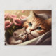Two gentle, cuddly souls, united in a peaceful moment. A mother cat and her little kitten, wrapped in a soft sheet, snuggle together, giving off a comforting warmth. The pink flowers surrounding them add a delicate touch to this charming scene. May these adorable kittens bring joy and tenderness to the lives of those who receive this postcard.