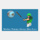 A woman batter, representing Mother Nature, hits a baseball-like globe of the Earth. Text reading "Mother Nature Always Bats Last" also appears. Causing changes in the environment can have unexpected, and unwanted, consequences. Choose your own background colour.