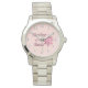 I had two concerns when ordering this watch - one that the watchband didn't look that glittery and two that the dial would be too large. Neither was a problem at all. The watch band is nice and glittery for a touch of bling. As to the size, I have small bones so I tend to like smaller looking accessories and I am quite comfortable with this. Neither too large or too small. The outside edge to edge on the dial is 1 1/4" the inside image is 1 inch.