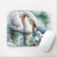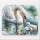 A graceful swan leans down towards its fluffy cygnet in tranquil waters