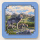 A mother wolf stands on a cliff overlooking a valley below with her two young wolf pups. This scenic country of mountains, rivers, forests, and meadows is the territory belonging to her wolf pack. The original painting is titled "Passing It On" because the mother wolf has brought her pups to this ridge to show them the vast and beautiful wilderness they will inherit when they grow up and take over as leaders of the pack. Accented with a pretty light blue patterned background.