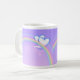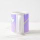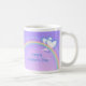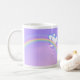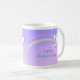 A mug with my original digital artwork of two white and blue hearts over a rainbow in a mauve or lilac coloured sky. Customisable text says "Happy Mother's Day".