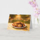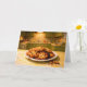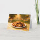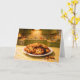 This greeting card features a photorealistic scene of a batch of homemade chocolate chip cookies arranged on a slightly chipped white ceramic plate. The cookies are imperfectly baked, with one showing a darker, overdone edge, adding a sense of realism and authenticity. A few crumbs from a broken cookie rest on a yellow and white formica tabletop dusted lightly with flour.