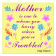 Emily Dickinson quote about Mother's Day " Mother is one to whom you hurry when you are troubled " . The design shows the quote in purple colour surrounded with some flowers and leaves in pretty colours : red , purple , blue , yellow and orange . It's suitable as a gift for your mum on Mother's Day .