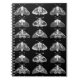 Notebook in a grid of detailed, beautiful moths in black and white, with shades of grey on a black background