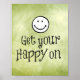 Motivational Get Your Happy On Quote Posters with face. Cute, fun, motivational quote poster about being happy....green gritty distressed background with pale yellow highlights.