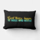 Motivational throw pillow with "good things happen to those who hustle " quote in yellow and aqua blue neon text. An inspirational design for any age!