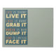 "Life is short - LIVE IT, Love is rare - GRAB IT, Anger is bad - DUMP IT, Fear is limiting - FACE IT". See my store for items with this design.