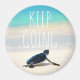 A baby turtle on the beach is trying to reach the ocean with a quote that says: Keep going.