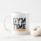 A mug with the motivating slogan "Gym Time No Excuses" in black and orange bold grunge text typography.