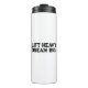 A thermal tumbler with the motivating slogan "Lift heavy, dream big." in single font distressed black text typography.