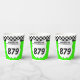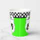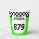 Tailgate in style at your next motocross race with personalised paper cups. These cups have a white number plate that's ready to be personalised with your name and bike number. The number plate is set against a bright green background with a black and white chequered flag border.