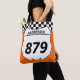 Tailgate in style at your next motocross race with a personalised tote bag. This bag has a white number plate that's ready to be personalised with your name and bike number. The number plate is set against an orange background with a black and white chequered flag border.