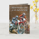 Card for dirt bike riding dad. Father's Day, or dad's birthday, greeting card with message. Motocross dirt bike riders race across the front of this folded, 5x7 inch card. A brown, grunge background with grey printed text. Sample wording on front is, "Happy Father's Day to an awesome Dad". It could easily be changed to "Happy Birthday". Customise with a message to dad inside, where the background is brown pebbles. The message is on top of a brown (mud) splatter. Perfect for sons, or daughters, who do Motocross with a dad who supports them. This design can be downloaded to share digitally.