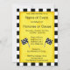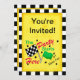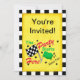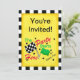 This invitation is great for a racing party, meeting or other motor racing event. The invitation has a black and white chequered border and the customisable words "You're Invited!". The graphic image includes the words "the party starts here" and "no 1 race fan" with a black and white chequered flag and a green flag. The other side of the invitation has fields to customise for your event. Two black and white chequered flags are featured on this side along with the same black and white chequered border. The background on each side of the invitation is textured yellow. Fully customise to personalise for your event.