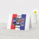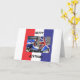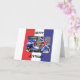 A red white and blue card with a Union Jack designed motor scooter on the front