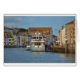 Motor yacht and colourful buildings in Weymouth, Southern England.
