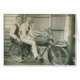 This card features a vintage 1930s photograph of two men, a boy, and a teddy bear posing on a motorbike. Blank inside.