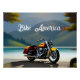A beautiful motorcycle is parked near a lake under a cloudy blue sky.