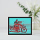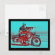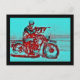 Graphic art from antique photo. Variety of dark reds ad turquoise in design depicting soldier on motorcycle about to fire weapon.