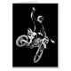 Pen & ink drawing of a motocross rider mid-jump, in bronco-buster clothes & pose. B/W, t-shirts, sweats, cards, prints, gifts.