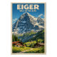 Travel poster featuring Mount Eiger, Switzerland, in a classic retro travel-poster style. Central focus on the dramatic North Face towering above alpine meadows, pine forests, and classic Swiss chalets beneath clear mountain skies. Crisp sunlight highlights rugged cliffs and snowfields, creating a bold, adventurous alpine atmosphere. Cool, powerful color palette of glacier white, steel gray, sky blue, and forest green. Clean graphic illustration with subtle vintage grain texture. Bold vintage typography headline: “EIGER – WALL OF THE ALPS”. Vertical 2:3 layout, high-resolution, print-ready.