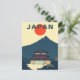 A striking Japan postcard featuring an artistic, graphic illustration of the country's most famous symbols. This minimalist travel poster style captures the serene beauty of Mount Fuji and a traditional temple under the iconic red sun.