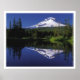Photograph of snow-capped volcanic, Mount Hood in Mount Hood National Forest, and the peak's reflection in Mirror Lake below.