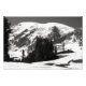 A black and white photograph of Mount Rainier covered with snow. Some stone is exposed. The volcano's ice and snow is melting away. A few trees break through the rugged landscape. Image Copyright ©2023 Kimberly J Tilley. zazzle.com/store/developingnature