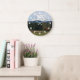 Decorate a living space with this stylish wall clock with white numerals and features a scenic landscape photo image of snow covered Mount Rainier and a green valley in the Pacific Northwest state of Washington. Select your clock style and size. Use to decorate a living room, dining room, kitchen, bedroom, or any other room.