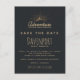 Save the date postcard with a gold coloured illustration on a black-grey background. Designed with an illustration of a mountain with the suns rays shining outward from behind. Typography says: Adventure explore dream discover.