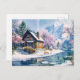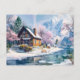 Vibrant illustration of a mountain cottage in spring. Melting ice and blooming trees bring life to the scene, ideal for nature and seasonal designs.