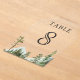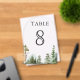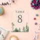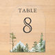 Elegant wedding table number featuring beautiful mountains and pine trees with modern typography.