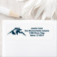 A cool mountain range real estate company return address label for a realty business located in a mountainous city or town. The realtor name is written in navy blue script under the house among mountains. Great marketing item for a mountaintop home builder.