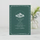 Illustration of mountains with evergreen trees and canoe on lake. Border is hand drawn scalloped doodle design. Background is emerald green.