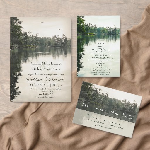 A peaceful riverside scene from one of my own personal photographs is the backdrop for this rustic wedding thank you sticker - reflected in calm but lightly rippled water under an overcast sky are distant evergreens and rock structures - a subtle watercolor effect has been applied to the image | part of the Mountain Lake Rustic Wedding Collection by katz_d_zynes >> https://www.zazzle.com/collections/119499271518309609