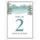 This table number features a watercolor lake scene with mountains in the background and evergreen trees. Add your custom information using the template form.