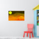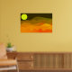This contemporary digital art is a colourful illustration of a retro-style evening mountains landscape with a moon in all shades of golden, black and red.