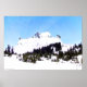 A painting of a snow covered mountain top that is the body for three young mountain goats. This winter mountainous scene features small groupings of pine trees, and a lovely blue sky.