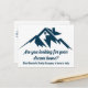 A cool mountain range real estate company postcards for a realty business located in a mountainous city or town. Your message is written in navy blue script under the house among mountains. Great marketing postcard for a mountaintop home builder.