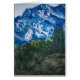 Landscape watercolor painting of snow covered mountains with green forest and boulders. Note Card