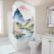 Watercolor scene of mountains and a river surrounded by trees and flowers of summer. Beautiful colours of blue and peach.