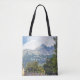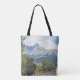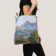 Tote Bag featuring a photo of majestic summer landscape. We see mountain peaks, blue sky and wooden cottages among trees. Great gift for nature, tourism, and hiking lovers. Please, personalise this Bag, adding your own message. For further modifications (font style, font colour, text position) click "Edit design”.