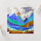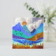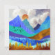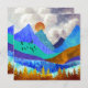 This gorgeous design depicts a colourful mountain landscape with puffy cloudy sky and rolling hills in bold textures and colours like blue, teal, cyan, gold, and orange.