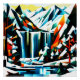 A.I. created interpretation from my description of a stylized cubist landscape showcases angular mountains with varying hues of blue, green, and yellow conveying a sense of depth and light. A cascading waterfall flows through the rocky terrain, contrasting sharply with the geometric shapes that compose the mountains and sky.