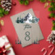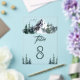 Elegant forest theme wedding table number card featuring beautiful mountains and pine trees,