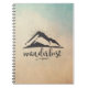 A spiral notebook with an outdoorsy minimalist style. Designed with an illustration of a mountain with sunrays emanating from behind. The word wanderlust written below. Background is a parchment colour with a hint of blue.