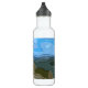 A bright, colourful abstract design of a mountain view, with blue sky, rock and trees.