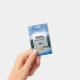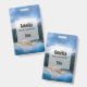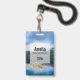 Name badge with a beautiful nature photo. Mountains in the background with a calm still lake in the foreground. Serene and relaxing photograph.