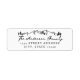 Custom-designed return address labels featuring hand-drawn style mountains and pine trees with personalised hand script family name and address.